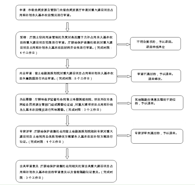 省土地勘测规划院依据永久基本农田数据库、土地利用总体规划数据库、耕地质量等别成果数据库、土地利用现状数据库、生态保护红线数据库,对重大建设项目占用和补划永久基本农田矢量数据进行内业审查,在2个工作日内完成审查工作,出具内业审查意见报送厅耕地保护监督处。厅耕地保护监督处在收到内业审查意见2个工作日内提出办理意见,对其中审查通过的项目组织开展外业踏勘,对审查不通过的项目退回申报单位。